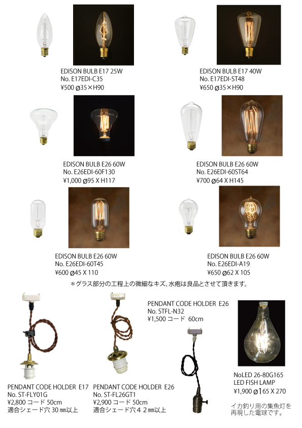 電球、ペンダントコード取り扱い一覧です。一部価格変更いたしました。